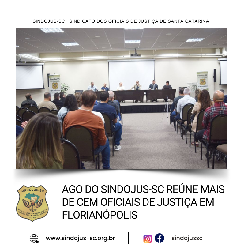 No último dia 7 de junho de 2025, o Sindicato dos Oficiais de Justiça de Santa Catarina (Sindojus-SC) realizou sua Assembleia Geral Ordinária (AGO), no Sesc Cacupé, em Florianópolis. O evento contou com a presença de mais de uma centena de oficiais de justiça, vindos de diversas regiões do Estado, demonstrando o engajamento e a união da categoria na luta por melhores condições de trabalho e valorização profissional.