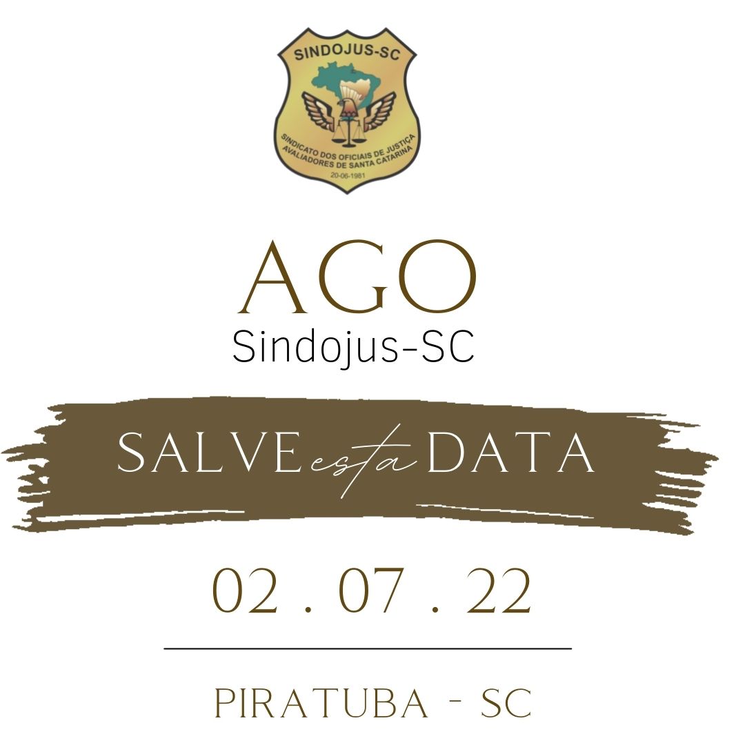 AGENDE-SE! A Diretoria do Sindojus-SC informa que a próxima Assembleia Geral Ordinária (AGO) da categoria será no dia 02 de julho de 2022, no Hotel Tirolesa, na cidade de Piratuba.