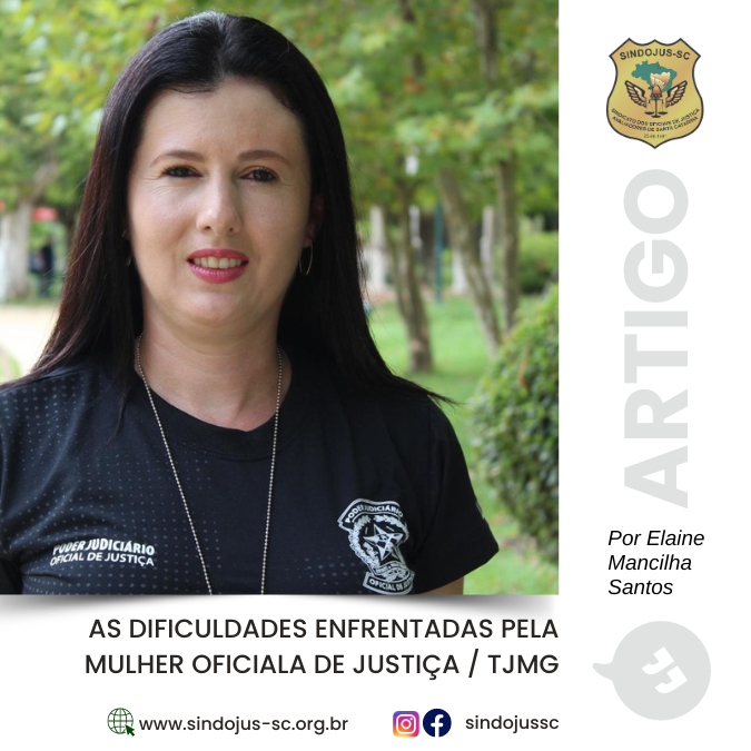 A Oficiala de Justiça pelo Estado de Minas Gerais, Elaine Mancilha Santos, acaba de publicar um artigo no site www.jus.com.br , tendo como tema: “AS DIFICULDADES ENFRENTADAS PELA MULHER OFICIALA DE JUSTIÇA DA PRIMEIRA INSTÂNCIA DO TRIBUNAL DE JUSTIÇA DO ESTADO DE MINAS GERAIS – TJMG E TRIBUNAL DE JUSTIÇA MILITAR DO ESTADO DE MINAS GERAIS – TJMMG”.