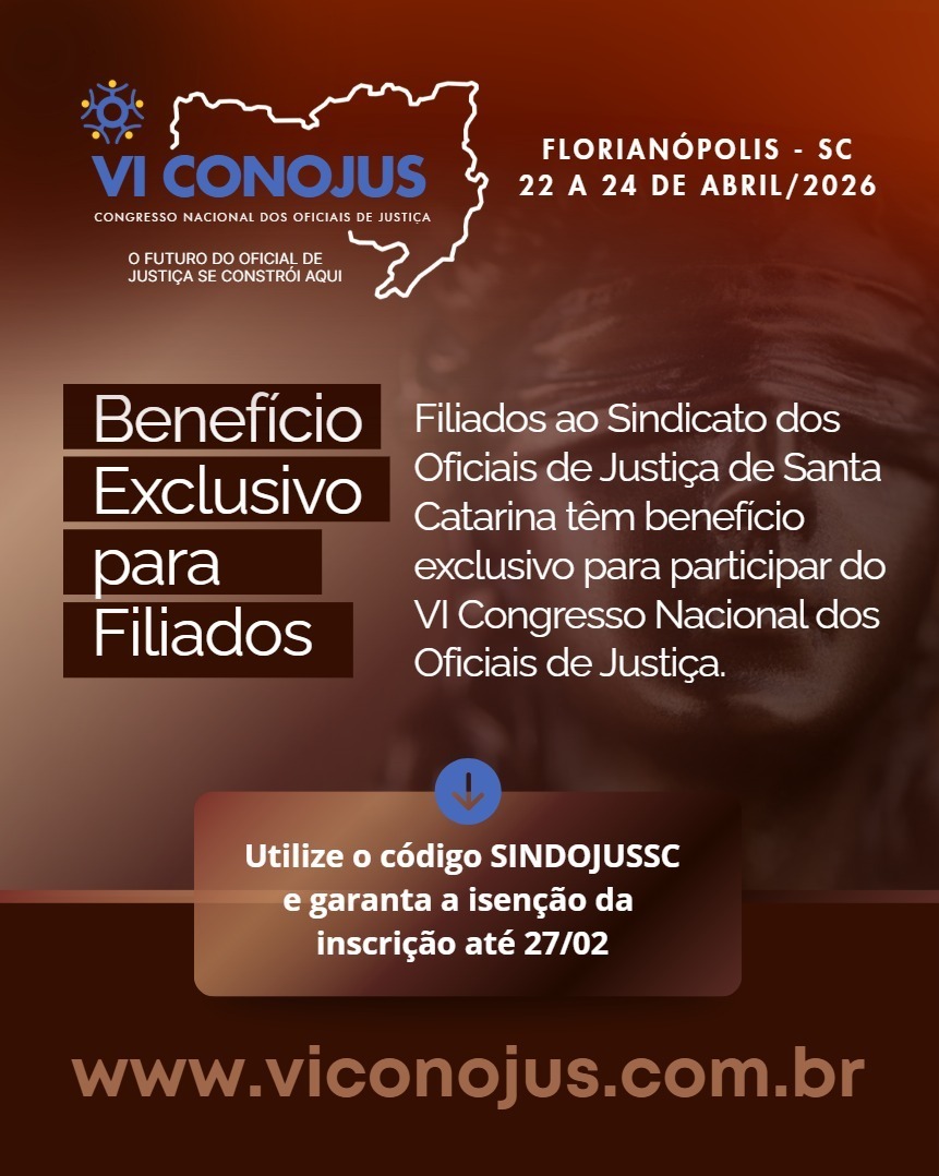 Sua participação está garantida no VI CONOJUS – Congresso Nacional dos Oficiais de Justiça, que acontece de 22 a 24 de abril, no Centro-Sul, em Florianópolis.