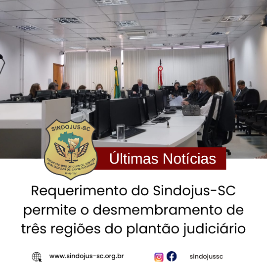 O Conselho da Magistratura do Tribunal de Justiça de Santa Catarina (TJSC) decidiu, por unanimidade, acolher, em parte, o requerimento formulado pelo Sindicato dos Oficiais de Justiça de Santa Catarina (Sindojus-SC), permitindo o desmembramento de três regiões do plantão judiciário devido a distância entre as Comarcas.
