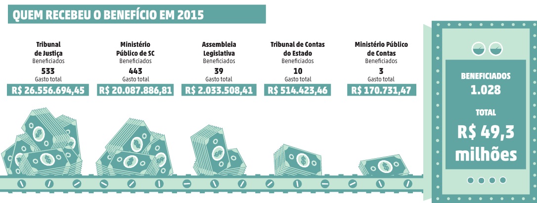 Em 2015, o Estado de Santa Catarina gastou quase R$ 50 milhões com auxílio-moradia para 1.028 integrantes da elite do funcionalismo: desembargadores, juízes, procuradores, promotores, conselheiros, auditores e deputados estaduais. Nenhum deles recebe menos de R$ 22,5 mil de salário e, mesmo assim, a legislação lhes garante esse complemento, que varia entre R$ 3,2 mil e R$ 4,3 mil mensais.