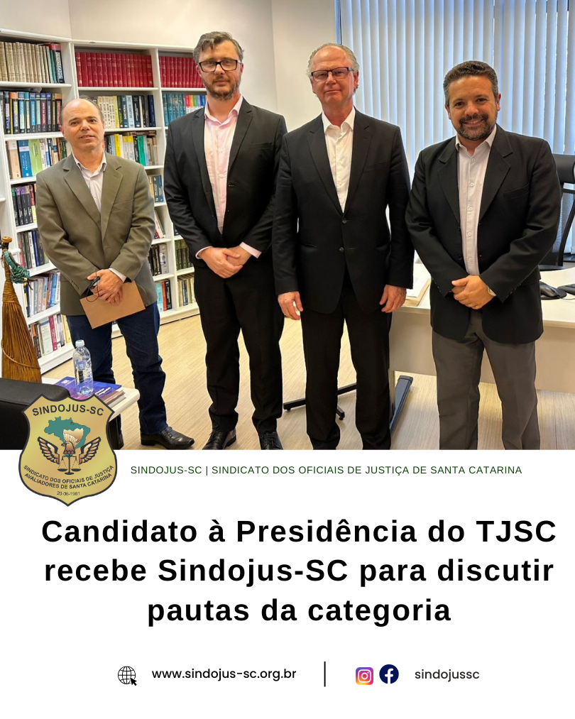 Os representantes do Sindojus/SC, foram recebidos para uma reunião a convite do Desembargador Rubens Schulz, candidato à Presidência do Tribunal de Justiça de Santa Catarina (TJSC), para tratar das principais pautas dos oficiais de justiça.