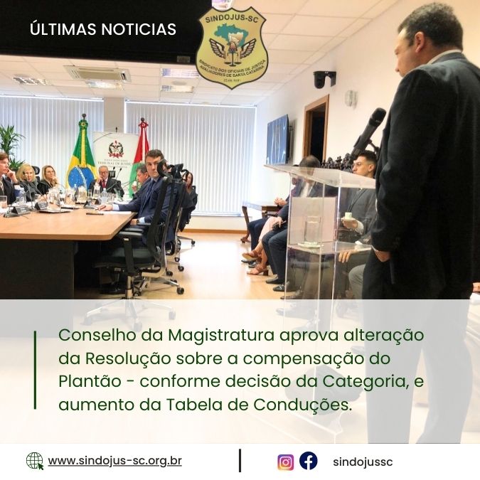 Em reunião do Conselho da Magistratura, realizada na tarde desta segunda-feira, dia 13 de novembro, no Salão Nobre do TJSC, foi aprovado o projeto de resolução que altera a Resolução CM 10/2023 - conforme deliberado pelos filiados em assembleia, de forma a permitir a opção entre folga ou pagamento em pecunia pela compensação do plantão.