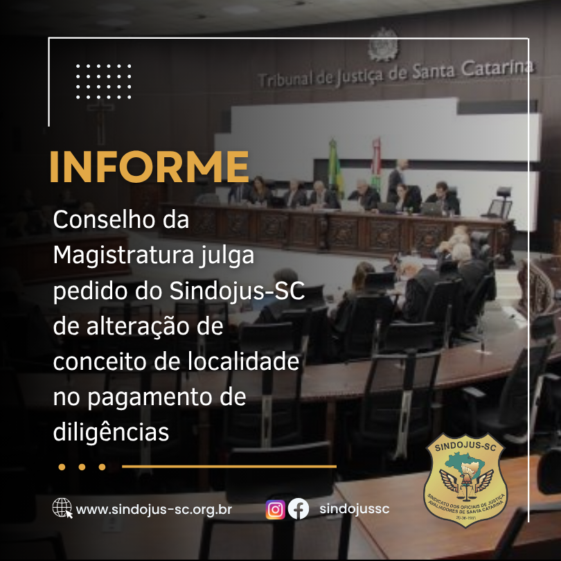 O Conselho da Magistratura do Tribunal de Justiça de Santa Catarina irá julgar, na próxima segunda-feira, 14 de julho, às 14horas, requerimento do Sindojus-SC que solicita alteração na Resolução CM 14/2024. O pedido do sindicato - SEI 0029028-03.2025.8.24.070, propõe a substituição do atual conceito de “localidade” pela expressão “residência, domicílio ou endereço comercial”, ou seja, “local”, com impacto direto no valor das diligências recebidas pelos oficiais de justiça.