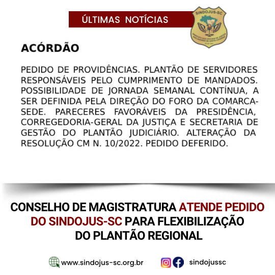 Em uma decisão unânime, o Conselho de Magistratura (CM), atendeu a deliberação da categoria na assembleia conjunta realizada pelo Sindicato dos Oficiais de Justiça do Estado de Santa Catarina (Sindojus-SC) e associação catarinense dos oficiais da infância e juventude (ACOIJ ) para alterar a Resolução CM n. 10/2022, incluindo dispositivo que permite à Direção do Foro da comarca-sede definir a escala de plantão dos Oficiais de Justiça em jornada semanal contínua. A decisão, tomada durante reunião do CM, em 11 de novembro, demonstra o apoio do TJSC à reivindicação da categoria na eficiência no cumprimento das funções judiciais.