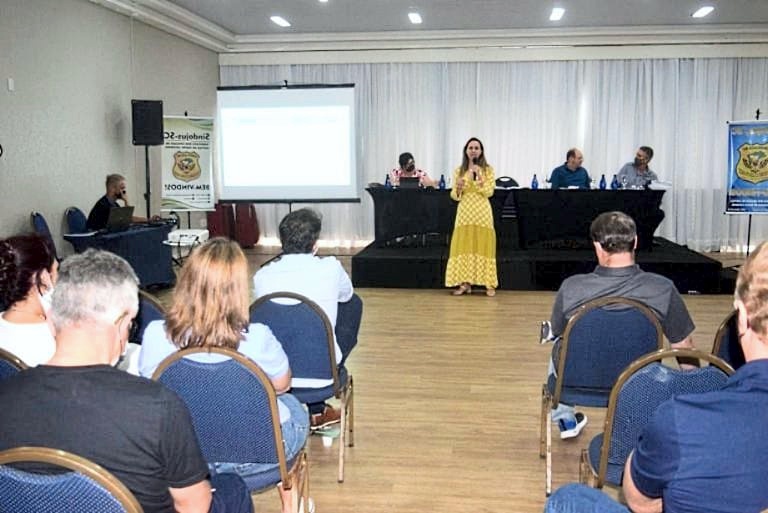 A AGO do Sindojus-SC, realizada na manhã do último sábado, 06/11, em Balneário Camboriú, contou com a participação da consultora de Previdência do Instituto de Previdência do Estado de Santa Catarina (Iprev), Karine Garcia, que falou aos filiados sobre a Reforma da Previdência. Garcia explicou as principais mudanças na lei, detalhando o histórico de emendas constitucionais, além de reforçar informações sobre regras de transição, pedágio para servidores, cálculo de proventos e contribuição previdenciária.