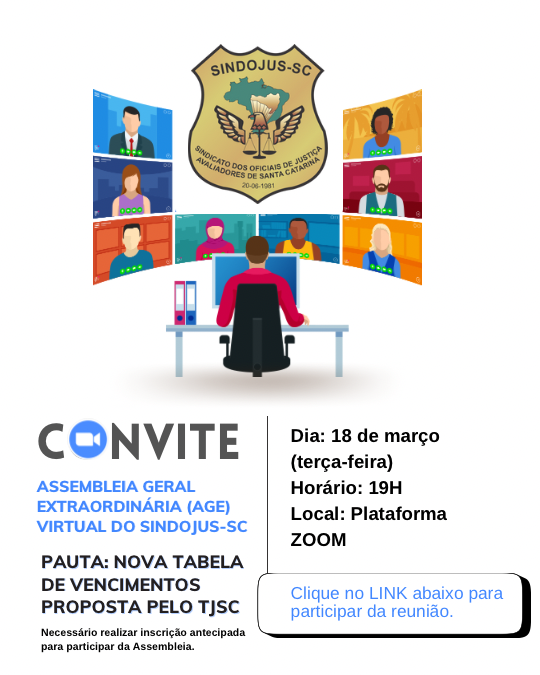 O Sindojus-SC convoca seus filiados para a Assembleia Geral Extraordinária (AGE), que será realizada de forma virtual no dia 18 de março, pela plataforma Zoom.