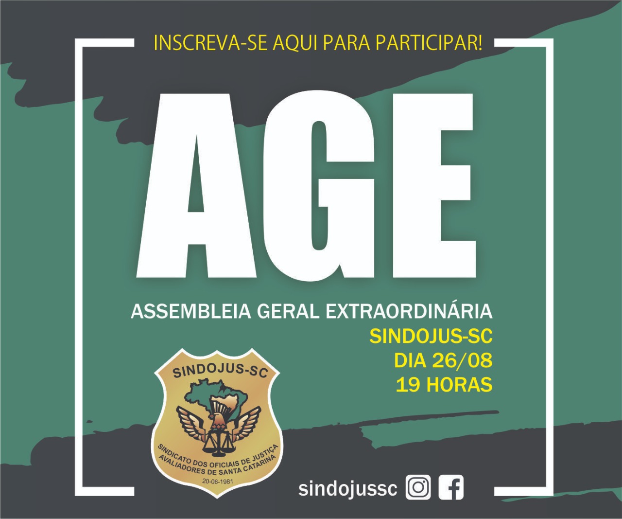 Nesta próxima quarta-feira, dia 26 de agosto, a partir das 19 horas, haverá Assembleia Geral Extraordinária (AGE) do Sindojus-SC por sistema virtual, para deliberar sobre a seguinte pauta: Informes; Cumprimento de Mandados - ampliação das exceções; Eleição Diretoria Executiva Sindojus-SC 2020/2023 - discussão sobre votação online do dia 16/09; além de Assuntos Gerais.