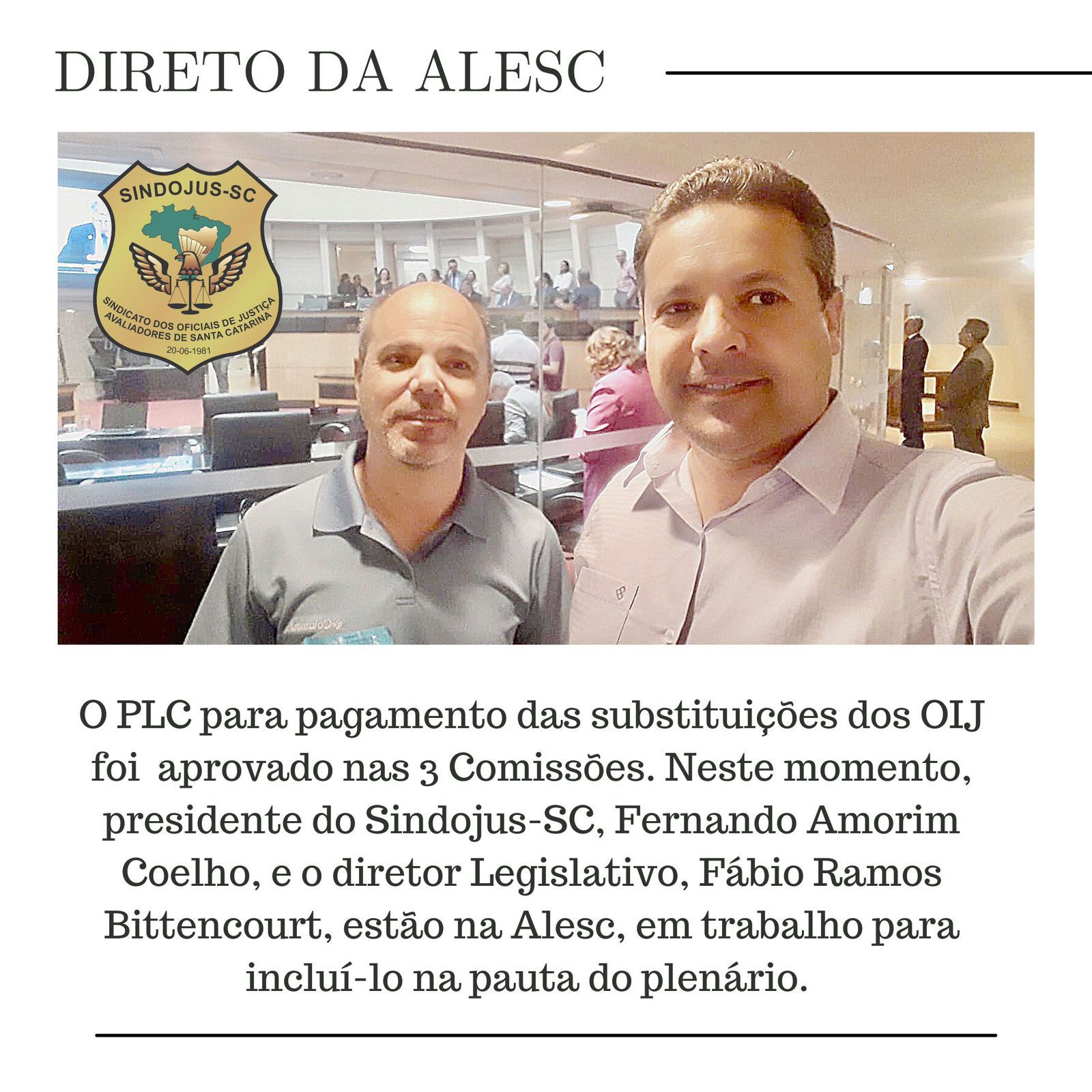 O PLC para pagamento das substituições dos OIJ foi aprovado nas 3 Comissões. Neste momento, presidente do Sindojus-SC, Fernando Amorim Coelho, e o diretor Legislativo, Fábio Ramos Bittencourt, estão na Alesc, em trabalho para incluí-lo na pauta do plenário.