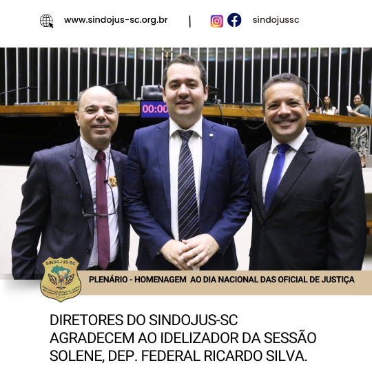 Como representantes da categoria do Oficiais de Justiça catarinenses na sessão solene em homenagem ao Dia Nacional da categoria, o presidente do Sindojus-SC, Fernando Amorim Coelho, e o diretor Legislativo, Fábio Ramos Bittencourt, aproveitaram a ocasião para agradecer o empenho do deputado Federal e Oficial de Justiça de carreira, Ricardo Silva, na organização e condução da homenagem à classe. A sessão foi realizada na manhã do dia 20, no Plenário Ulysses Guimarães, na Câmara dos Deputados, sendo proposta e presidida por Silva, após intensa articulação das entidades nacionais da categoria.