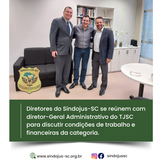 Nessa semana, os Diretores do Sindojus-SC - seu presidente, Fernando Amorim Coelho, e o diretor Jurídico, Rafael Hamilton Fernandes de Lima, reuniram-se com o diretor-Geral Administrativo do Tribunal de Justiça de Santa Catarina (TJSC), Alexsandro Postali, para tratar de problemas recorrentes da categoria. Entre as questões operacionais e salariais discutidas, estavam as novas impressoras que estão sendo instalada em todo o Estado, que têm prejudicado a eficiência nas atividades cotidianas.