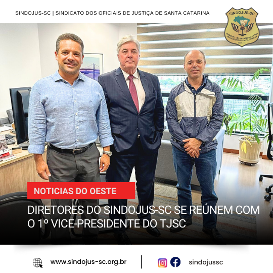 Na última quarta-feira, 19 de fevereiro, os diretores do Sindojus-SC se reuniram com o primeiro vice-Presidente do Tribunal de Justiça de Santa Catarina (TJSC), desembargador Cid Goulart Jr., que integra o Órgão Especial e o Conselho da Magistratura. Durante o encontro, foram tratados dois processos de grande interesse da categoria: o recurso contra a decisão que suspendeu o pagamento de diligências para mandados cumpridos exclusivamente por WhatsApp e o desmembramento das regiões de plantão judicial.