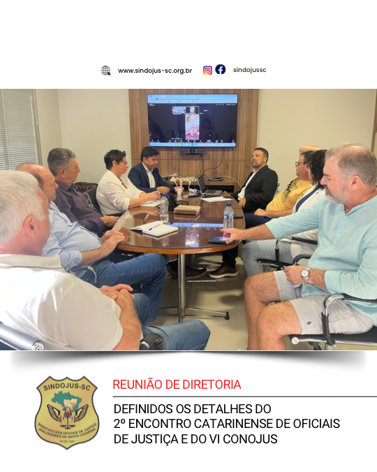 Em reunião realizada na última segunda-feira, 29, na sede do Sindojus-SC, em Florianópolis, a Diretoria da entidade deliberou sobre temas relevantes para a categoria, avaliou ações recentes e confirmou a realização de dois grandes eventos que marcarão o calendário da Justiça catarinense e nacional.