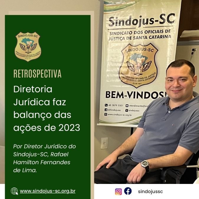 Também a atualização dos procedimentos SEI em que o Sindojus - SC consta como interessado, tiveram relevância no ano que passou, assim como, as providências tomadas junto à Corregedoria, buscando dirimir as hipóteses de expedição de mandados de condução de testemunha em Comarcas diversas da lotação do oficial de justiça ; “em breve, iremos aprofundar este, assim como muitos assuntos que ainda ficaram pendentes em 2023, sempre visando a melhoria do cotidiano de trabalho e vida do filiados”, finalizou.
