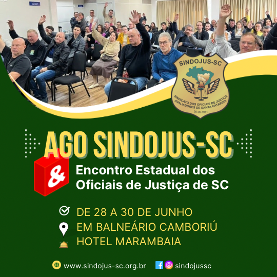 O Sr. FERNANDO AMORIM COELHO, presidente do SINDICATO DOS OFICIAIS DE JUSTIÇA AVALIADORES DE SANTA CATARINA- SINDOJUS-SC, no uso das atribuições que lhe confere os Estatutos da Entidade, CONVOCA a todos os Filiados do SINDOJUS-SC, para a ASSEMBLEIA GERAL ORDINÁRIA, a realizar-se no dia 29 de junho de 2024 (sábado) às 08:30 horas em primeira convocação com no mínimo 1/5 dos filiados ou às 9:00 horas, em segunda convocação com qualquer número de filiados presentes, no Salão de Eventos do Marambaia Hotel e Convenções, sito à AvAtlântica, 300, na cidade de Balneário Camboriú/SC, a fim de deliberarem sobre a seguinte PAUTA: