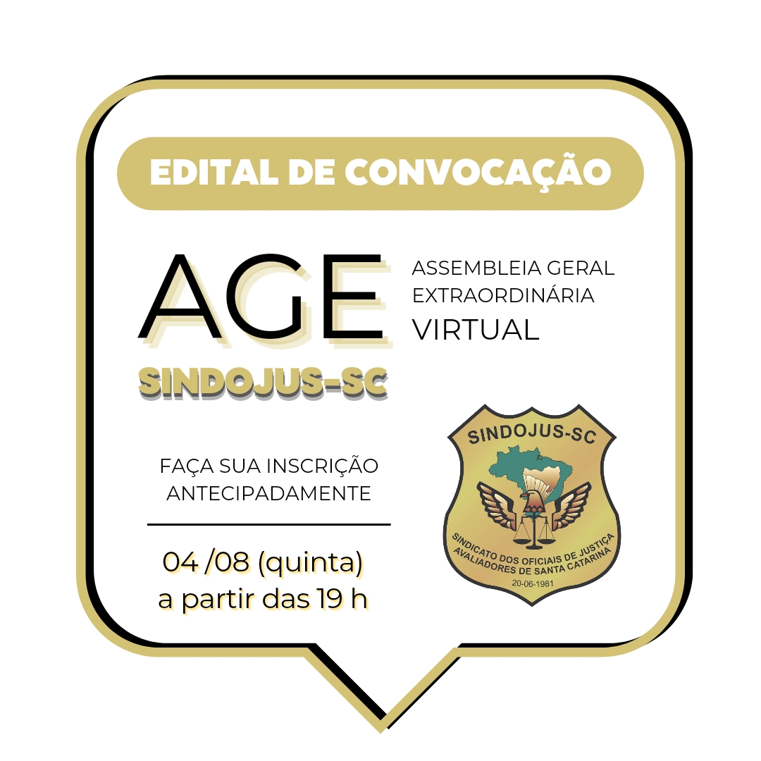O Sr. Evaldo Cassol, presidente do SINDICATO DOS OFICIAIS DE JUSTIÇA AVALIADORES DE SANTA CATARINA- SINDOJUS/SC em exercício , no uso das atribuições que lhe confere o Estatuto da Entidade, CONVOCA todos os Filiados do SINDOJUS/SC, para a ASSEMBLEIA GERAL EXTRAORDINÁRIA VIRTUAL (via plataforma ZOOM), a realizar-se no dia 04 de agosto de 2022 (quinta-feira) às 19h em primeira convocação com no mínimo 1/5 dos filiados, conforme previsto no art. 10 do Estatuto, ou às 19h30, em segunda convocação com qualquer número de filiados presentes, a fim de deliberarem sobre a seguinte PAUTA: