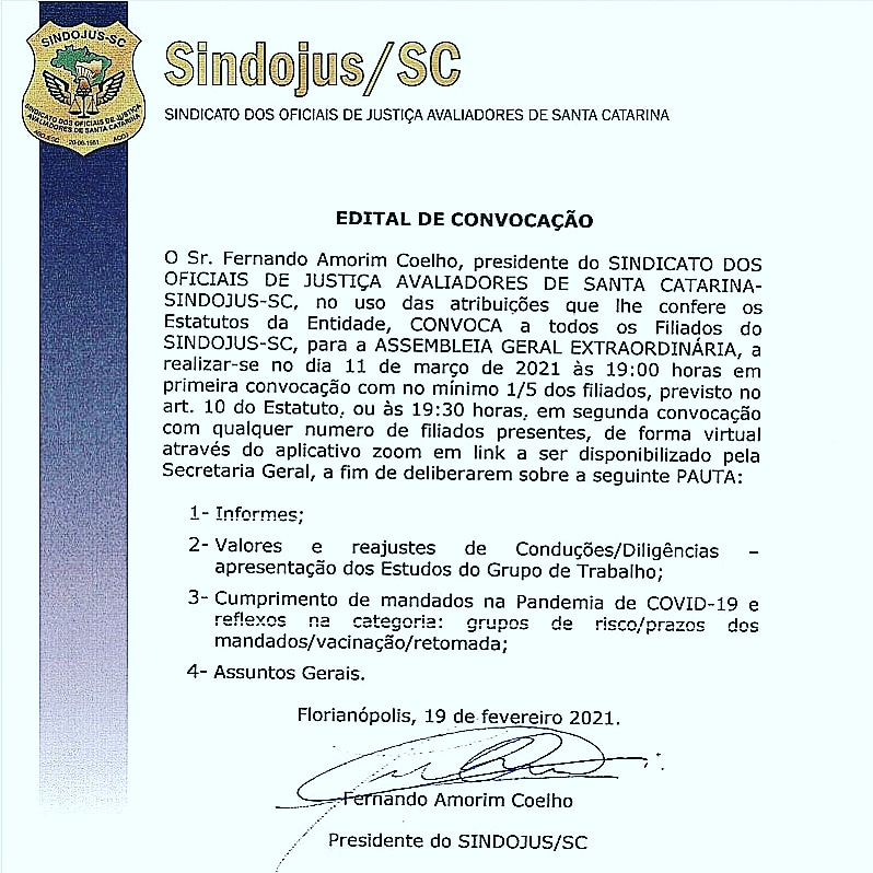 O sr. Fernando Amorim Coelho, presidente do SINDICATO DOS OFICIAIS DE JUSTIÇA AVALIADORES DE SANTA CATARINA - SINDOJUS-SC, no uso das suas atribuições que lhe confere os Estatutos da Entidade, CONVOCA a todos os filiados do SINDOJUS-SC, para ASSEMBLEIA GERAL EXTRAORDINÁRIA - AGE, a realizar-se no dia 11 de março de 2021, às 19 horas em primeira convocação como no mínimo 1/5 dos filiados, conforme previsto no art.10 do Estatuto, ou às 19h30 em segunda convocação com qualquer número de filiados presentes, de forma virtual através do aplicativo ZOOM, em link a ser disponibilizado pela Secretaria Geral, a fim de deliberarem sobre a seguinte PAUTA: