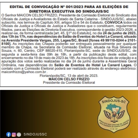 O Senhor MAICON CELSO FRIZZO, Presidente da Comissão Eleitoral do Sindicato dos Oficiais de Justiça e Avaliadores do Estado de Santa Catarina - SINDOJUS/SC, abaixo subscrito, nos termos do Capítulo XIII, artigos 53 e 54 do Estatuto, CONVOCA todos os Oficiais de Justiça e Oficiais de Justiça e Avaliadores que o constituem, regularmente filiados, para as Eleições de Diretoria Executiva, correspondente à gestão 2023-2026, a realizar-se, de forma centralizada [art. 45, §1o do Estatuto], no dia 24 de junho de 2023, das 13h às 17h, nas dependências do Salão de Eventos do Hotel Le Canard, situado na Avenida Presidente Vargas, 255, Lages/SC, Brasil [fones 49 99110-0244 e 2101-8100]. As inscrições das Chapas poderão ser entregues pessoalmente por qualquer membro da Chapa, na Secretaria da Comissão Eleitoral, situada na Rua Silveira de Souza, n. 60, Centro, CEP 88020-410, Florianópolis-SC, sede do SINDOJUS/SC, de segunda a sexta-feira das 09h às 18h, a partir da publicação deste edital, com encerramento no dia 19 de maio de 2023 às 18h. As inscrições dos fiscais de votação e a apuração dos votos serão realizadas no dia 24 de junho durante a Assembleia Geral Ordinária, nas dependências do Salão de Eventos do Hotel Le Canard Lages. O contato com a Comissão Eleitoral poderá ser realizado através do endereço eletrônico: maiconfrizzo@yahoo.com.br .