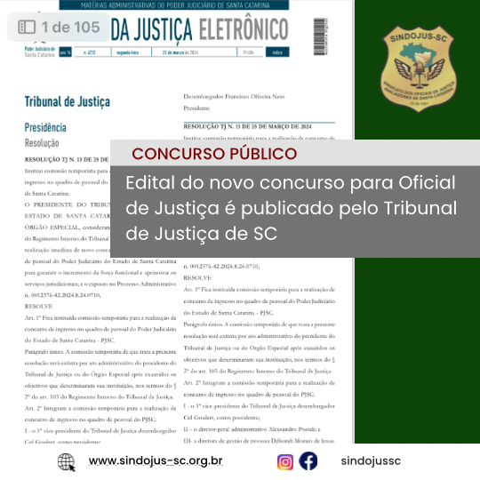 A abertura do novo processo, vem logo a seguir do fim do prazo do último concurso. Uma iniciativa que, para o presidente do Sindojus-SC, Fernando Amorim Coelho, demonstra a importância da carreira e do Oficial de Justiça para o TJSC. “Veja, mesmo com o grande número de nomeações com o fim do concurso anterior, já está sendo planejado o próximo. Isso, para que o Tribunal não fique sem reposição das vagas dos cargos que vagarem daqui para frente”, esclarece.