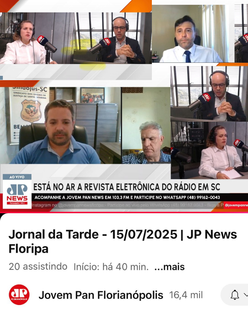No dia 15 de julho, o Oficial de Justiça Ricardo Prado, o presidente do SINDOJUS-SC Fernando Amorim Coelho e o presidente da FESOJUS-BR João Batista Fernandes participaram de uma importante entrevista ao Jornal da Tarde, da Jovem Pan News Floripa, com os apresentadores Rafael Polito e Sibeli Godoi.