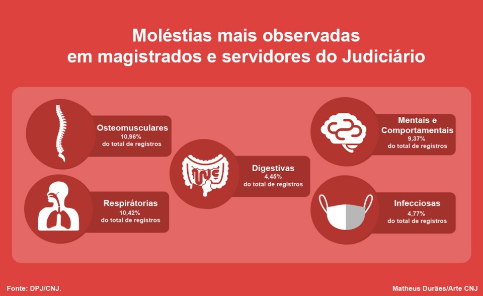 Não há o predomínio marcante de determinada moléstia entre as que mais atingem magistrados e servidores do Poder Judiciário. Ao longo de 2016, foram registradas 1.420 diferentes doenças ou condições clínicas distintas. Entre as categorias de moléstia, a mais observada entre magistrados e servidores, segundo o levantamento, foram as doenças do sistema osteomuscular e do tecido conjuntivo, com 10,96% do total. Em seguida, aparecem as doenças do aparelho respiratório, com 10,42%, transtornos mentais e comportamentais, com 9,37%, doenças infeccionais e parasitárias, com 4,77%, e doenças do aparelho digestivo, com 4,45%.