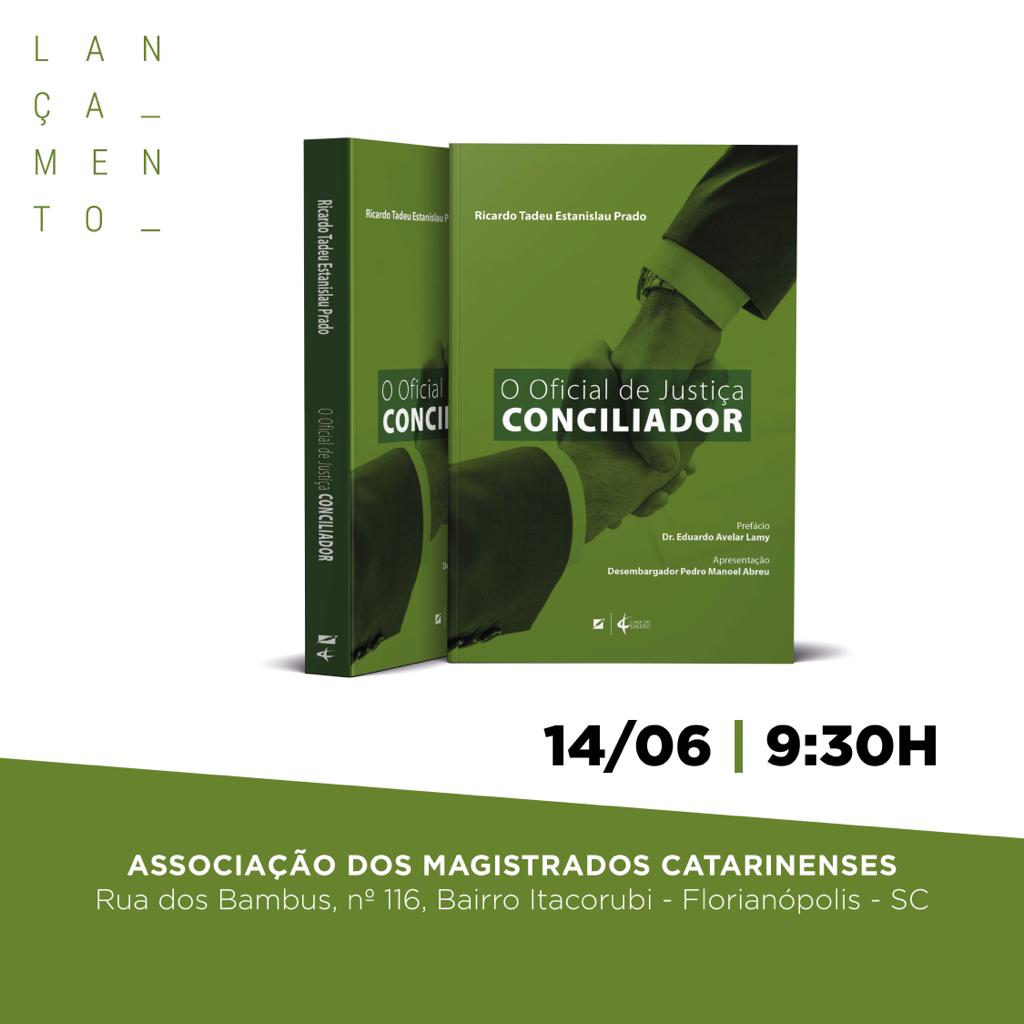 O Oficial de Justiça, Ricardo Prado, lança esta semana o livro "Oficial de Justiça Conciliador". O evento de lançamento acontecerá na próxima sexta-feira, dia 14, a partir das 9h30, na sede da Associação dos Magistrados Catarinense, sito à Rua dos Bambus, nº 116, Bairro Itacorubi, em Florianópolis (público em geral) e às 11h20, no auditório do Pleno (restrito aos participantes do FONAJE - Fórum Nacional de Juizados Especiais).