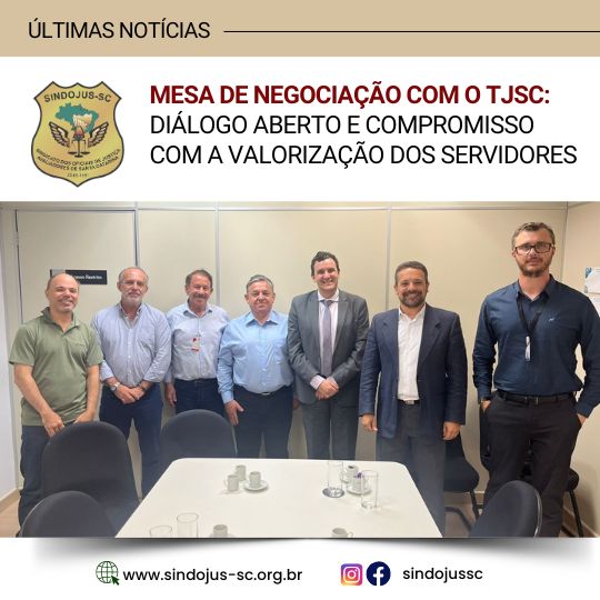 Na tarde de ontem, dia 31 de outubro, o diretor-Geral Administrativo do Tribunal de Justiça de Santa Catarina (TJSC), Alexsandro Postali, recebeu os Diretores do Sindojus-SC, AESC, ACOIJ, ACAPEJE E ATJ, para mais uma rodada da mesa de negociação. Em parceria, eles buscam soluções que promovam não apenas condições de trabalho mais justas, discutindo a readequação da tabela de vencimentos, dentre outros assuntos prementes aos oficiais de justiça e demais servidores representados no encontro - a próxima rodada de negociação está marcada para o dia 11 de novembro.