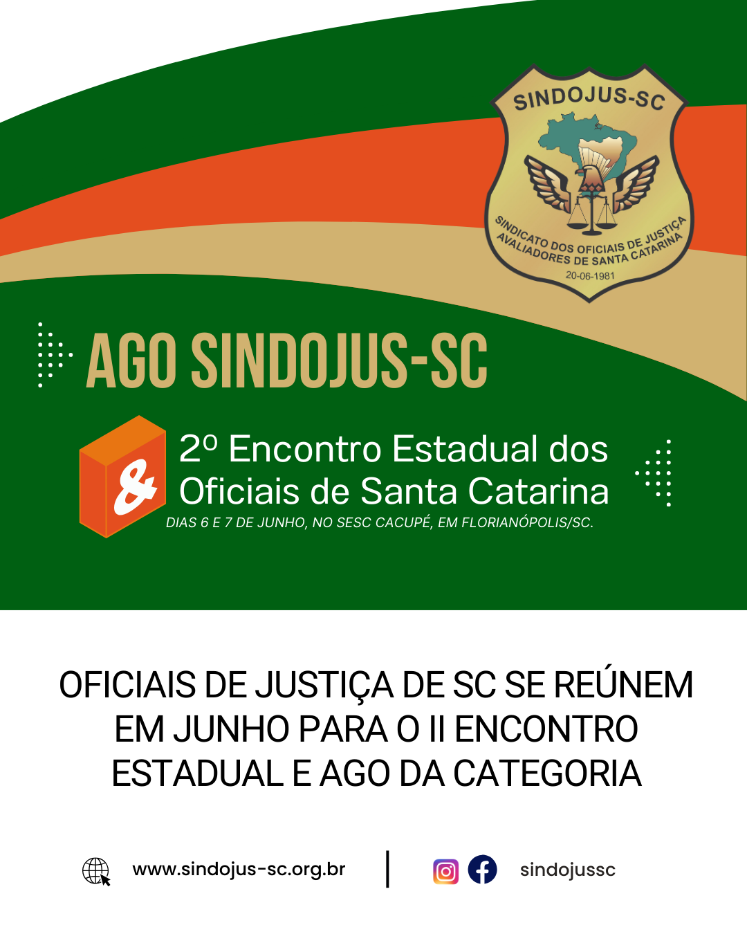 O Sindicato dos Oficiais de Justiça Avaliadores de Santa Catarina – Sindojus-SC, convida todos os seus filiados a participarem do II Encontro Estadual dos Oficiais de Justiça e da Assembleia Geral Ordinária (AGO), que acontecem entre os dias 6 e 7 de junho de 2025, no Espaço Santa Catarina – Sesc Cacupé, em Florianópolis/SC. O evento é realizado em parceria com a ACOIJ (Associação dos Oficiais de Infância e Juventude), contando com a certificação da Escola de Oficiais, reconhecida pela Escola do Judiciário do TJSC.