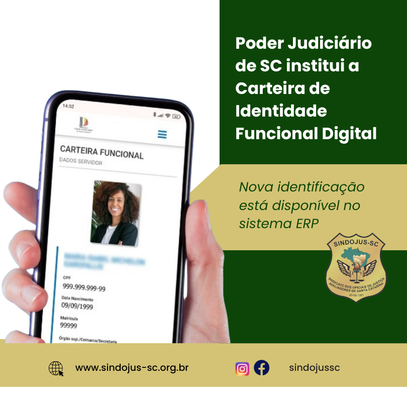 O Poder Judiciário de Santa Catarina (PJSC), por meio da Resolução GP n. 29/2025, instituiu a Carteira de Identidade Funcional Digital para os servidores e as servidoras ocupantes de cargo de provimento efetivo ou de cargo em comissão. A nova identificação está disponível no sistema ERP, no módulo ADMRH - Gestão de Recursos Humanos, no site do TJSC.