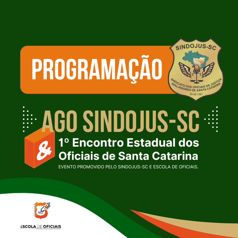 O Sindojus-SC – Sindicato dos Oficiais de Justiça de Santa Catarina, em parceria com a Escola de Oficiais, realiza, de 28 a 30 de junho, o 1º Encontro Estadual dos Oficiais de Santa Catarina e AGO da categoria. O evento acontece nas dependências do Marambaia Hotel e Cnvenções, na Comarca de Balneário Camboriú. Confira a seguir a PROGRAMAÇÂO dos EVENTOS.