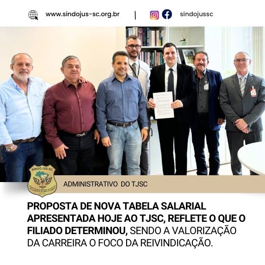 O Sindojus-SC, em parceria com as associações representativas dos servidores do Tribunal de Justiça de Santa Catarina (TJSC), apresentou no último dia 16 de setembro, uma proposta de nova tabela salarial ao diretor-Geral Administrativo do TJSC, Alexsandro Postali, que preside a mesa de negociação. A proposta básica reflete o que foi discutido pela categoria em assembleia, com ganho para todos, prevendo aumento de referências (letras) em quantidade e valor.