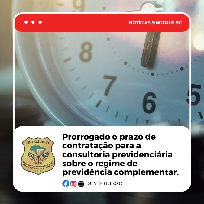 A Diretoria do Sindojus-SC informa que foi prorrogado o prazo de contratação para a consultoria previdenciária sobre o regime de previdência complementar do Estado de Santa Catarina. Para garantir a contratação, é necessário que: