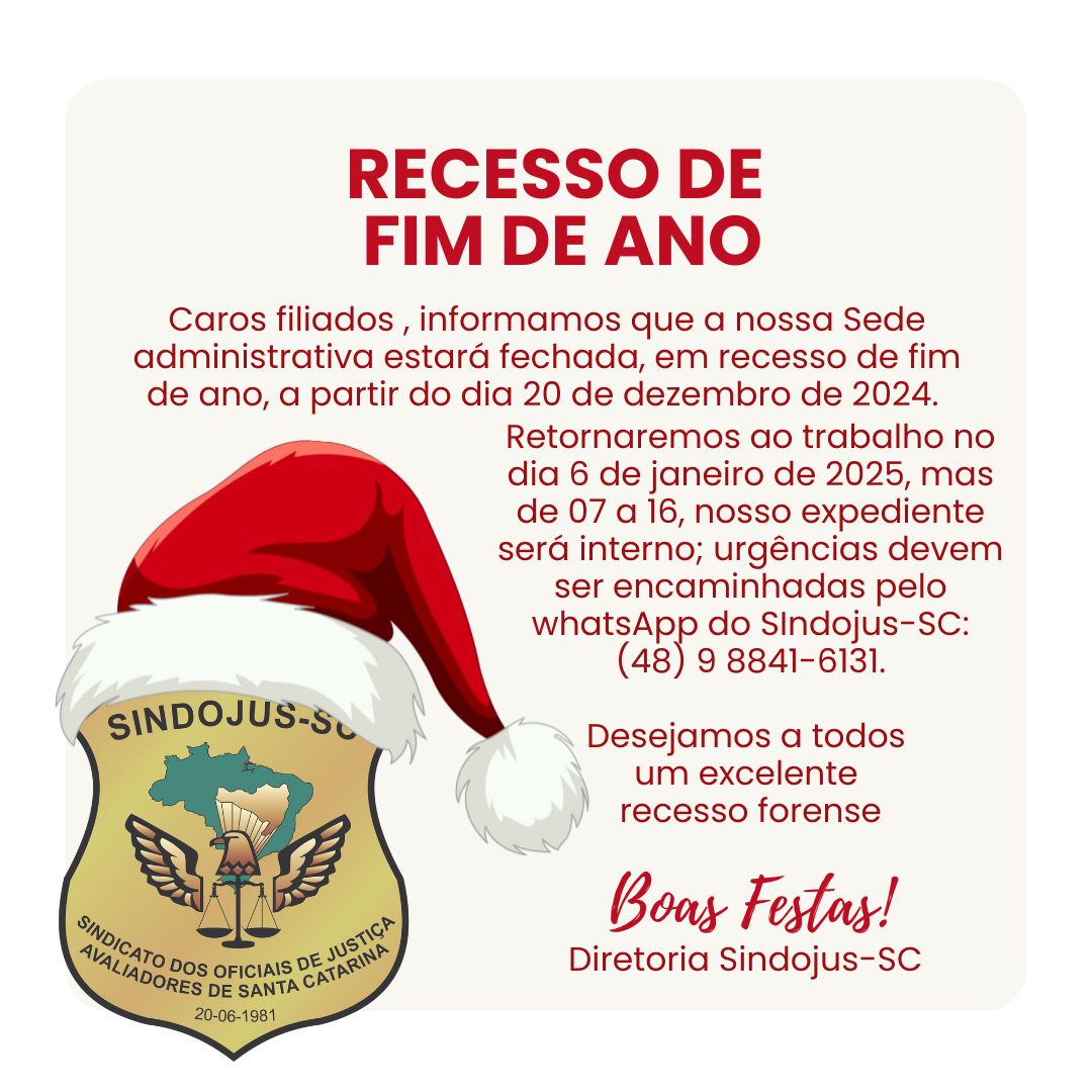 Caros filiados , informamos que a nossa Sede administrativa estará fechada, em recesso de fim de ano, a partir do dia 20 de dezembro de 2024. Retornaremos ao trabalho no dia 6 de janeiro de 2025, mas de 07 a 16, nosso expediente será interno; urgências devem ser encaminhadas pelo whatsApp do SIndojus-SC: (48) 9 8841-6131.