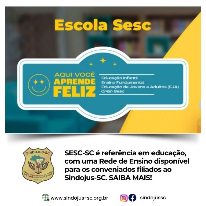 Como conveniado, o filiado ao SINDOJUS-SC, bem como seus dependentes (filhos e cônjuge), pode utilizar deste serviço de ensino. Informe-se no SESC-SC mais próximo de você.