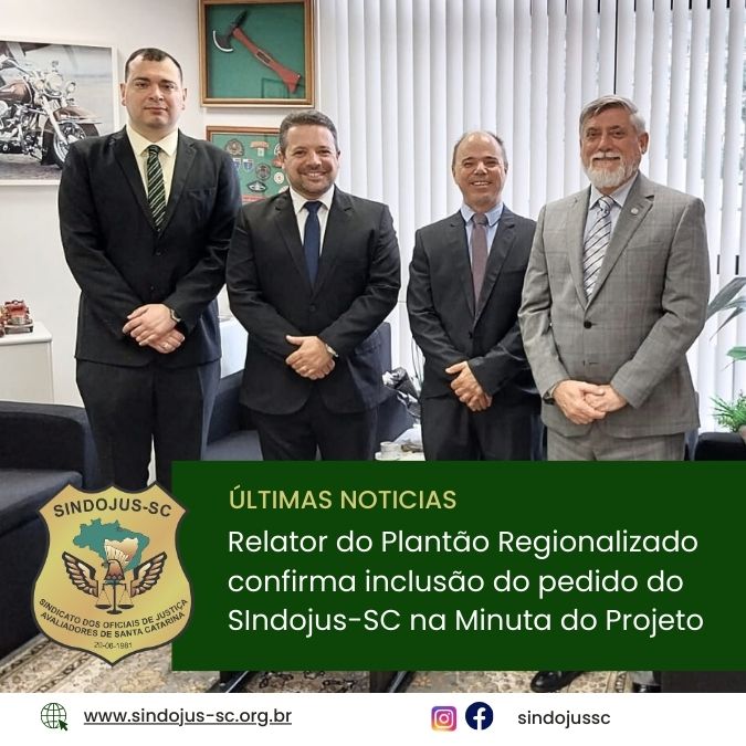 Em reunião no TJSC, na última quarta-feira, 1 de novembro, com o desembargador Luiz Antonio Zanini Fornerolli, os Diretores do Sindojus-SC confirmaram o encaminhamento da decisão da AGE, através de requerimento feito pela entidade no que se refere ao Plantão Regionalizado.