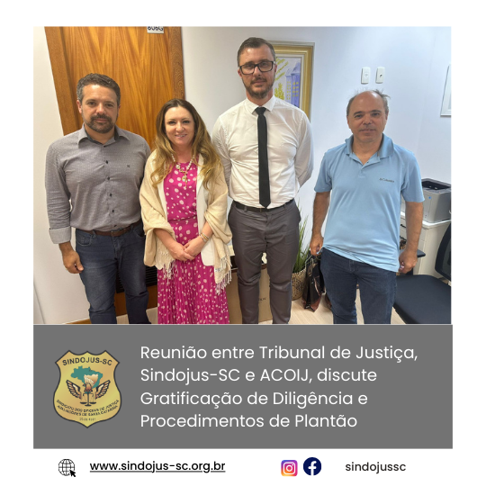 Na última segunda-feira, dia 16 de dezembro, ocorreu uma importante reunião entre representantes do Tribunal de Justiça de Santa Catarina (TJSC), do Sindicato dos Oficiais de Justiça de Santa Catarina (Sindojus-SC) e da Associação Catarinense dos Oficiais da Infância e Juventude (ACOIJ). O encontro teve como foco principal a discussão sobre a gratificação de diligência dos oficiais de justiça e os procedimentos relativos aos plantões, especialmente no que tange o encaminhamento de adolescentes.