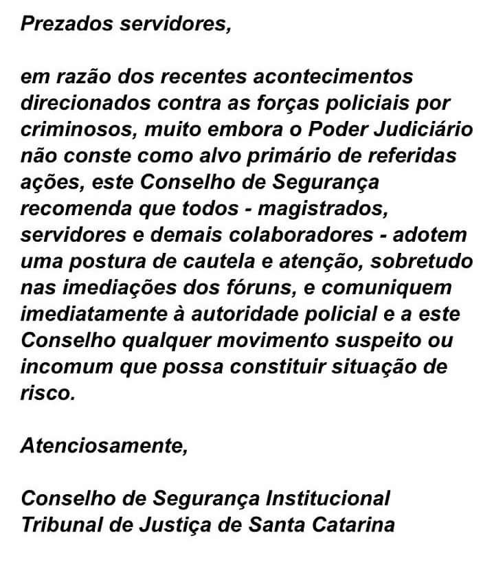 A Diretoria do Sindojus-SC alerta a categoria para que tomem as devidas precauções quanto a sua segurança pessoal. Ressalta ainda que estará protocolando na Comissão de Segurança Institucional do TJSC, pedido para que este comunique aos Oficiais de Justiça de maneira imediata quando houver informações do setor de inteligência da Segurança Pública que coloquem em risco a categoria. A ideia é que o referido Conselho repasse esses comunicados através dos celulares do plantão aos Oficiais plantonistas, que informarão sobre a situação aos seus colegas da Comarca, garantindo que os mesmos não se exponham ao perigo no cumprimento dos mandados.