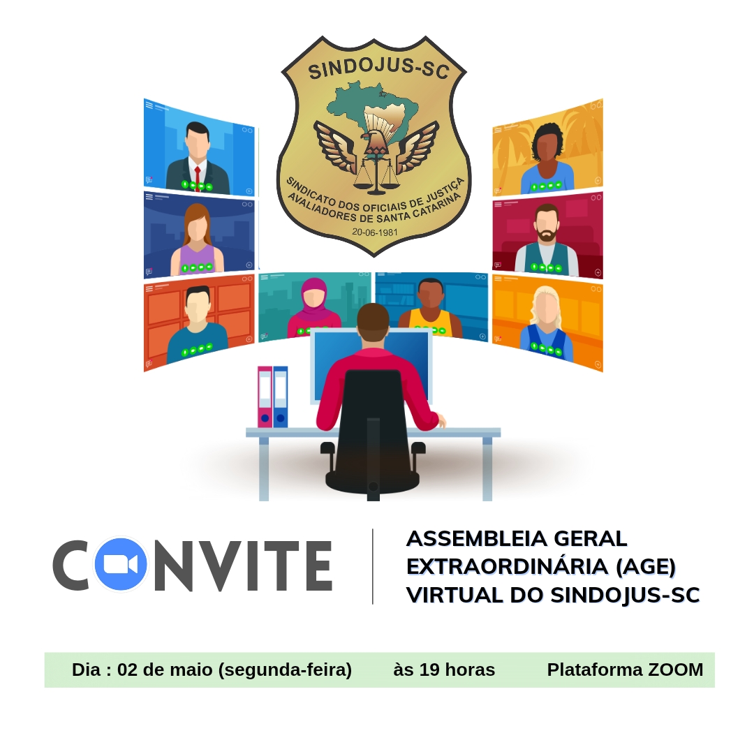 O Sr. Fernando Amorim Coelho, presidente do SINDICATO DOS OFICIAIS DE JUSTIÇA AVALIADORES DE SANTA CATARINAS - SINDOJUS-SC, no uso das atribuições que lhe confere os Estatutos da Entidade, CONVOCA a todos os Filiados do SINDOJUS-SC, para a ASSEMBLEIA GERAL EXTRAORDINÁRIA (AGE), a realizar-se no dia 02 de maio de 2022, às 19 horas, em primeira convocação, com no mínimo 1/5 dos filiados, previsto conforme art. 10 do Estatuto, ou às 19h30, em segunda convocação, com qualquer número de filiados presentes, de forma virtual, através do aplicativo ZOOM, em link disponibilizado abaixo, a fim de deliberarem sobre a seguinte PAUTA: