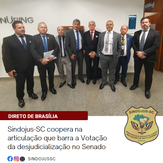 Em Brasília, Diretores da FESOJUS-BR e Sindojus de diferentes Estados, entre eles, Santa Catarina, obtiveram uma grande vitória para a categoria no que se refere ao Projeto 4188/ 2021 da Desjudicialização. A matéria, oriunda da Câmara Federal, acaba de chegar ao Senado e, na manhã da última terça-feira, 27, após incessante articulação no Senado, os representantes da categoria dos Oficiais de Justiça conseguiram barrar sua possível votação ainda esta semana.