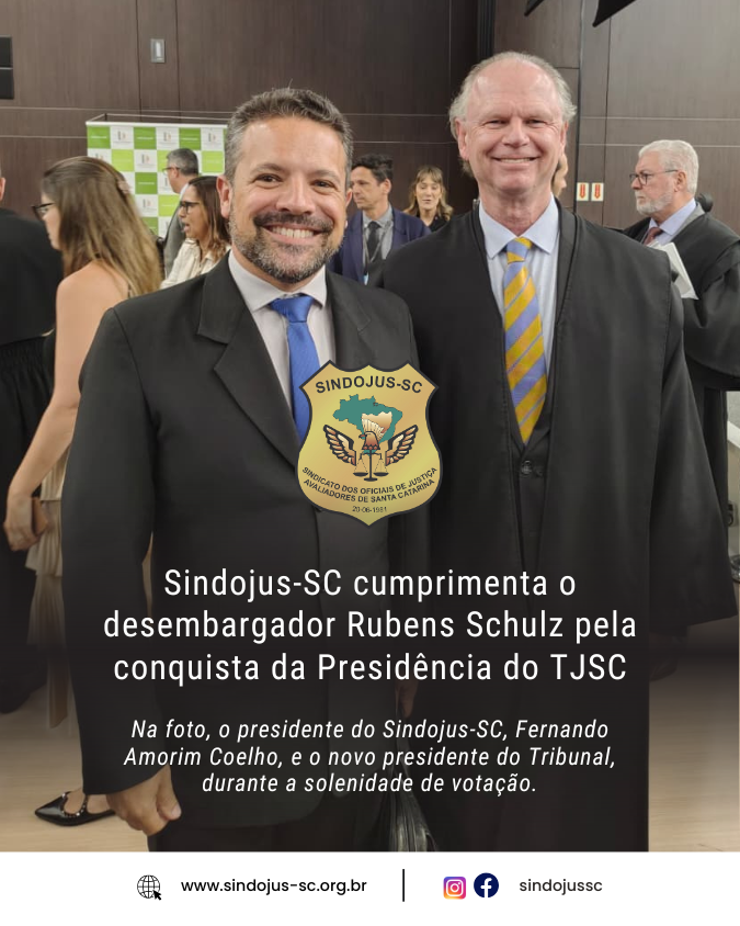 O Sindojus-SC deseja ao futuro presidente e a toda a nova Administração do TJSC um profícuo mandato à frente do Judiciário catarinense, marcado por equilíbrio administrativo, valorização dos servidores e sensibilidade às demandas da categoria dos oficiais e oficialas de justiça.