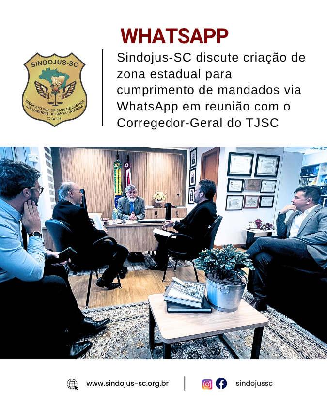 A Diretoria do Sindojus-SC participou, na tarde da última quarta-feira, de reunião com o Corregedor-Geral da Justiça do Tribunal de Justiça de Santa Catarina (TJSC), Desembargador Luiz Antônio Zanini Fornerolli, para discutir o cumprimento de mandados via WhatsApp no Estado.