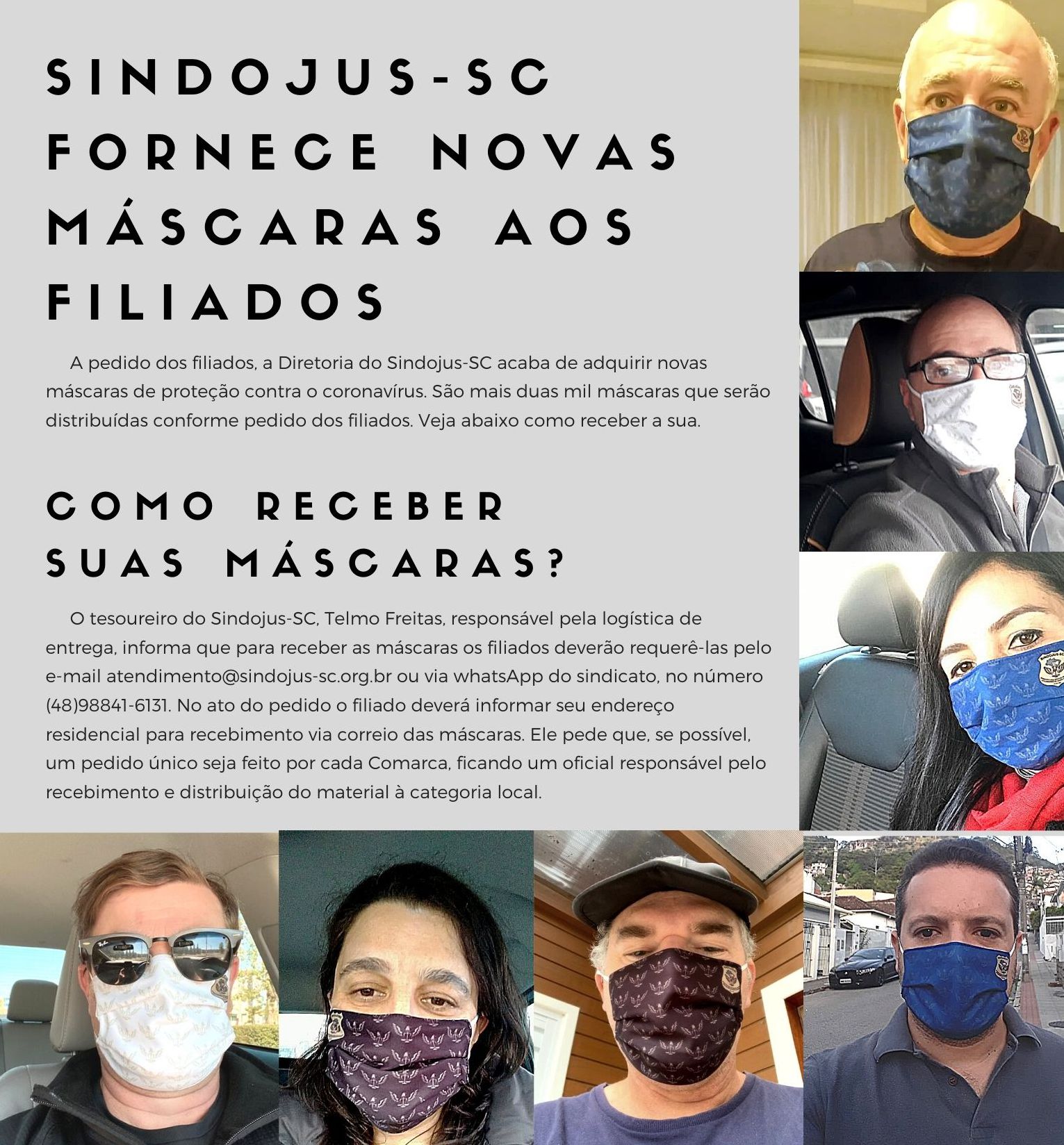 O tesoureiro do Sindojus-SC, Telmo Freitas, responsável pela logística de entrega, informa que para receber as máscaras os filiados deverão requerê-las pelo e-mail atendimento@sindojus-sc.org.br ou via whatsApp do sindicato, no número (48)98841-6131. No ato do pedido o filiado deverá informar seu endereço residencial para recebimento via correio das máscaras. Ele pede que, se possível, um pedido único seja feito por cada Comarca, ficando um oficial responsável pelo recebimento e distribuição do material à categoria local.