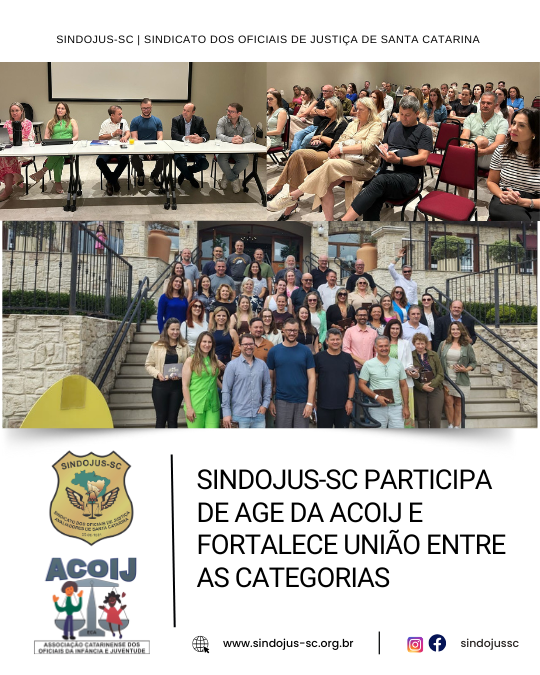 A Associação Catarinense dos Oficiais da Infância e Juventude (ACOIJ) realizou, em março, a Assembleia Geral Extraordinária (AGE) da categoria, em Gramado (RS). O encontro, que contou com a presença do vice-presidente do Sindojus-SC, Evaldo Cassol, simbolizou mais um passo concreto na aproximação e no fortalecimento da união entre os oficiais de justiça e os oficiais da infância e juventude de Santa Catarina.