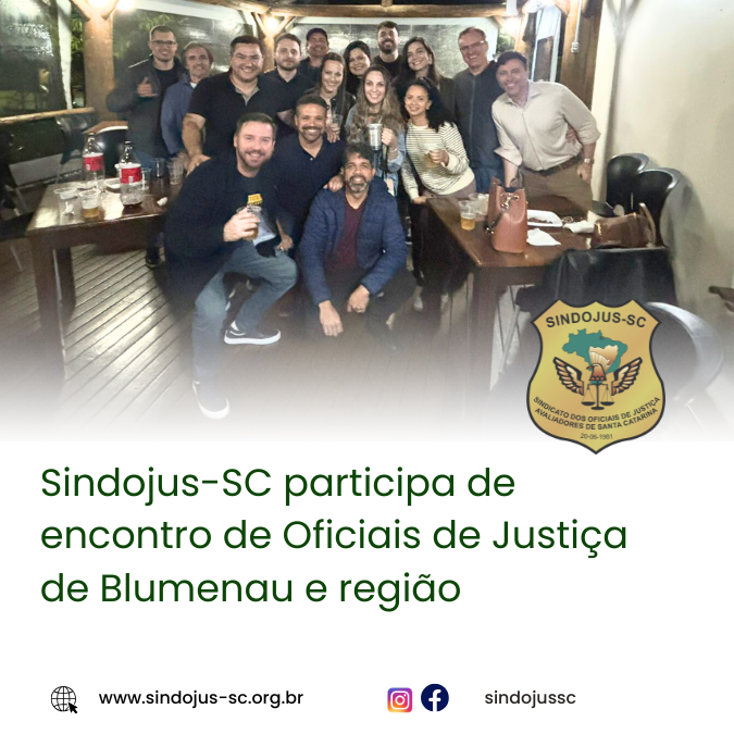 O Sindojus-SC marcou presença no encontro dos Oficiais de Justiça de Blumenau e região, realizado no dia 21, no Bela Vista Country Club, em Gaspar. O evento reuniu Oficiais das comarcas do médio vale, promovendo integração, diálogo e fortalecimento da categoria.