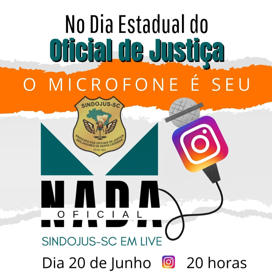 Neste domingo, dia 20, o Sindicato dos Oficiais de Justiça de Santa Catarina (Sindojus-SC) promove uma live em comemoração ao Dia Estadual do Oficial de Justiça. A data estadual foi instituída pela Lei nº 13.623, de 19 de dezembro de 2005, de autoria do deputado estadual Onofre Santo Agostini.