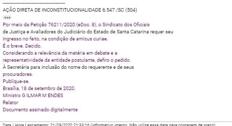 Nesta data foi publicada a decisão do ministro Gilmar Mendes, do STF, acolhendo o pedido do SINDOJUS-SC de ingresso como participante como _amicus_ na ADI 6547.