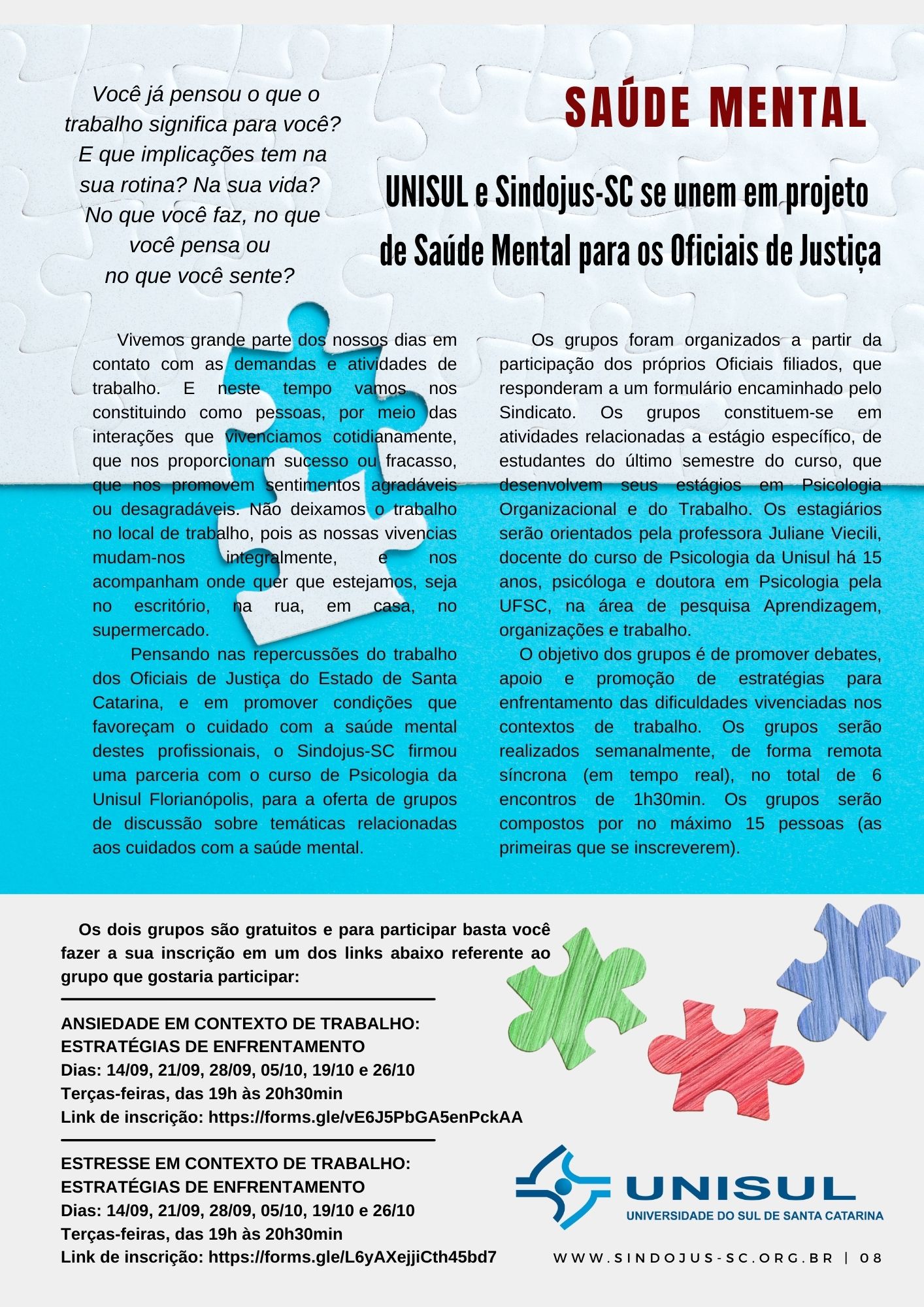 Pensando nas repercussões do trabalho dos Oficiais de Justiça do Estado de Santa Catarina, assim como em promover condições que favoreçam o cuidado com a saúde mental destes profissionais, o Sindojus-SC firmou uma parceria com o curso de Psicologia da Unisul Florianópolis, para a oferta de grupos de discussão sobre temáticas relacionadas aos cuidados com a saúde mental.